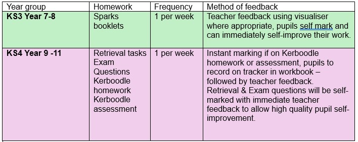Homework across both Key Stage 3 and 4 plays a vital role in reinforcing learning. It is important that homework is purposeful and adds to the development of understanding in pupils.